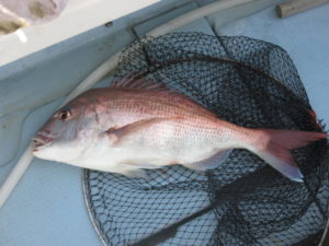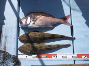 M様乗船で7:30出航…ベイトを釣りヒラメを狙う…最初の当たりはエイの特大、次の当たりは真鯛60 …マゴチ60と55でヒラメを期待したが潮が緩み次の当たりはエイでした…下げ潮を期待して流し何度か当たりは有ったが食い込みが悪いので13:50納竿としました!