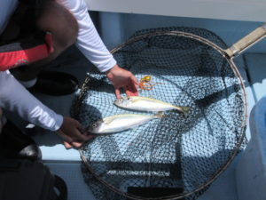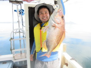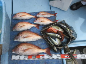 2025年7月19日 / 最終更新日時 : 2025年7月19日 kotobukimaru 釣果情報 小潮 鯛ラバ 今日は4名様と鯛ラバ釣りで6:30出航…最初は下げ潮での釣り開始…中々当たりが無く辛抱の時間帯…潮が緩み出した頃やっと当たり 本命が連続で釣れる 潮が止まると当たりも遠のき上げ潮のポイントに移動し仕掛けを投入しながら深場を狙うとポッポッと当たり出す…13:00まで船を流し真鯛やアジを釣り納竿としました…釣果は真鯛50㎝超え2枚含む6枚と真アジ30㎝超え~27㎝程を数枚とガラカブ等々でした。 暑い中皆様お疲れ様でした!