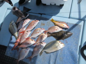 2025年10月5日 / 最終更新日時 : 2025年10月5日 kotobukimaru 釣果情報 真鯛テンヤ N様とお孫様…真鯛狙いで出航…最初は少し深場を狙ったが潮が動いてないので釣り場を移動…浅場だが潮流れは速い(2㏏以上)程流している…釣り再開後早々にヒレコ鯛がヒット、その後真鯛が当たり出すと中型サイズばかりで有る…良型サイズを求めて幾度も同ポイントを流すが真鯛の㎏オーバーは上がりませんでしたが外道でコロダイやヒラメ・へ鯛・ヨコスジフエダイ等々が釣れ12:00頃納竿としました! 10月ですがまだまだ暑いです =お疲れ様でした=