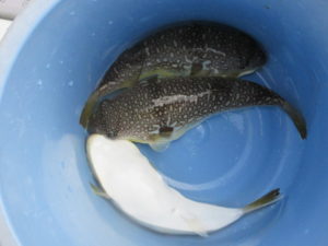 カットウ釣りでフグでもと思いam7:30頃出航したのですが、下げ潮時刻まで殆ど流れず上げ潮になっても流れが無い…潮が流れ出した頃から北風が強くなり白波が立ちだす、我慢してしばらく流すとブッキン(フグ)がヒット、次に甲烏賊が連発したが次第に波が高くなり出し最後の流しでブッキンが2枚、イイダコ1枚、12:30納竿としました。イイダコはリリースしました。 水温が今日は14.7℃程で流れが無いとやはり魚の活性も低いです?